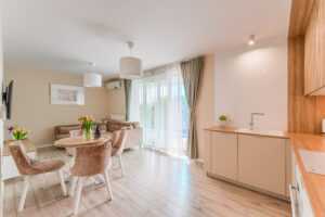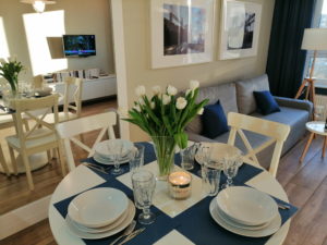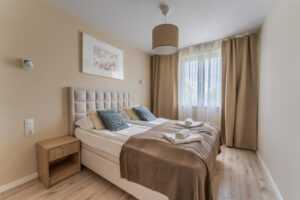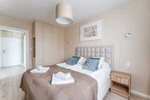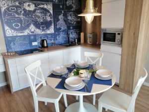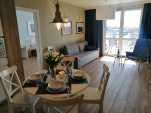 Przytulny, dwupokojowy apartament (45m2) na zamkniętym osiedlu, usytuowany na Wyspie Solnej, ulica Szpitalna 8, . Lokal znajduje się na pierwszym piętrze z dużym balkonem, z którego rozpościera się przepiękny widok na rzekę. Komfortowe spanie dla 4 -5 osób – sypialnia z szerokim łożem małżeńskim, w salonie rozkładana kanapa. Parking dla gości. Pokój dzienny połączony z aneksem kuchennym. Możliwość dostawienia komfortowej dostawki hotelowej dla piątej osoby.